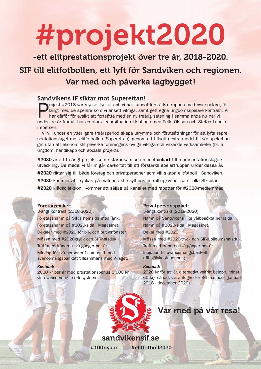 Vårt tidigare elitprestationsprojekt #2018 blev lyckat då vi uppnådde målet att få föreningens herrlag till Division 1 och stanna kvar där tack vare företag och över 100 privatpersoner. Vi tar nu nästa steg och kopplar på Projekt #2020 med samma syfte; att ta nästa steg mot elitfotboll i Sandviken. Vi behöver er hjälp och hoppas skapa ett intresse som möjliggör denna satsning vidare upp i seriesystemet.