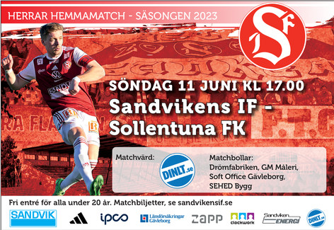 Sista hemmamatchen innan sommaruppehållet för herrarna spelas söndag 11/6 på Jernvallen. Sollentuna FK står för motståndet i den 12:e omgången av Ettan. Sollentuna ligger på nionde plats i tabellen och har två raka förluster på hemmaplan, mot Piteå och Nordic United, vi kan räkna med ett motståndarlag som kommer kriga hårt för poängen.