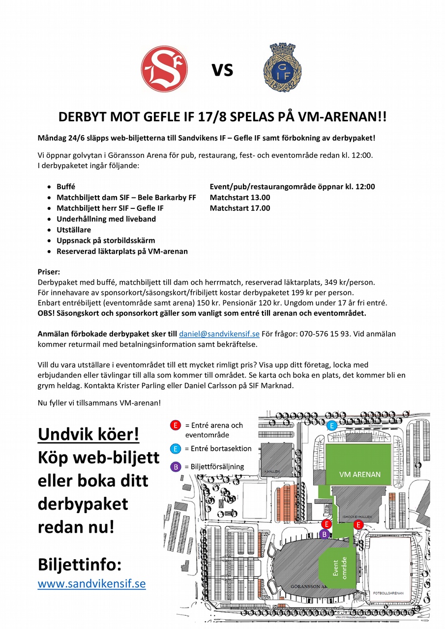 Biljettsläpp och förbokning av derbypaket finns nu tillgängliga. Entrébiljett som gäller hela dagen till eventområdet och VM-arenan kostar 150kr för vuxen och 120 kr för pensionär. Komplett derbypaket med mat (buffé) och garanterad läktarplats kostar 349 kr. Har du redan säsongskort kostar derbypaketet 199 kr.