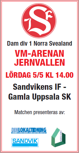 Under lördagen kommer Gamla Uppsala SK till Sandviken och spelar lagens fjärde omgång i division 1 norra Svealand. Våra Sandvikendamer som tagit 6 poäng på 3 matcher möter nu ett motstånd som har med sig en vinst på sina tre spelade. GUSK som senast kommer från en seger har ett gott självförtroende men damerna vill såklart mer än gärna ta poäng i premiären på VM arenan som äntligen ligger på plats. Gamla Uppsala har ett bra starkt lag med goda kvaliteter men hade en tuff start mot ett taggat Bollstanäs som de i premiären fick stora siffror mot sig i resultatet. Däremot hämtade man sig och visade att man var att räkna med när man vann senast mot Selånger.
